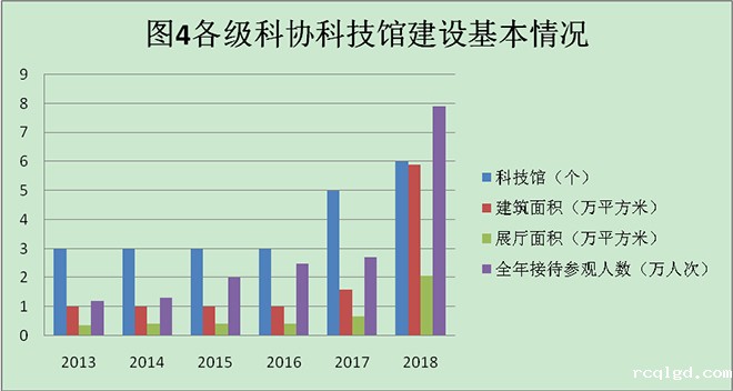 截至2018年底,各级科协拥有所有权或使用权的科技馆[25]6个。总建筑面积59052平方米,展厅面积20754平方米。已实行免费开放的科技馆6个。科技馆全年接待参观人数7.9万人次,其中少年儿童参观人数5万人次。科普活动站(中心、室)1129个,全年参加活动(培训)人数176万人次。