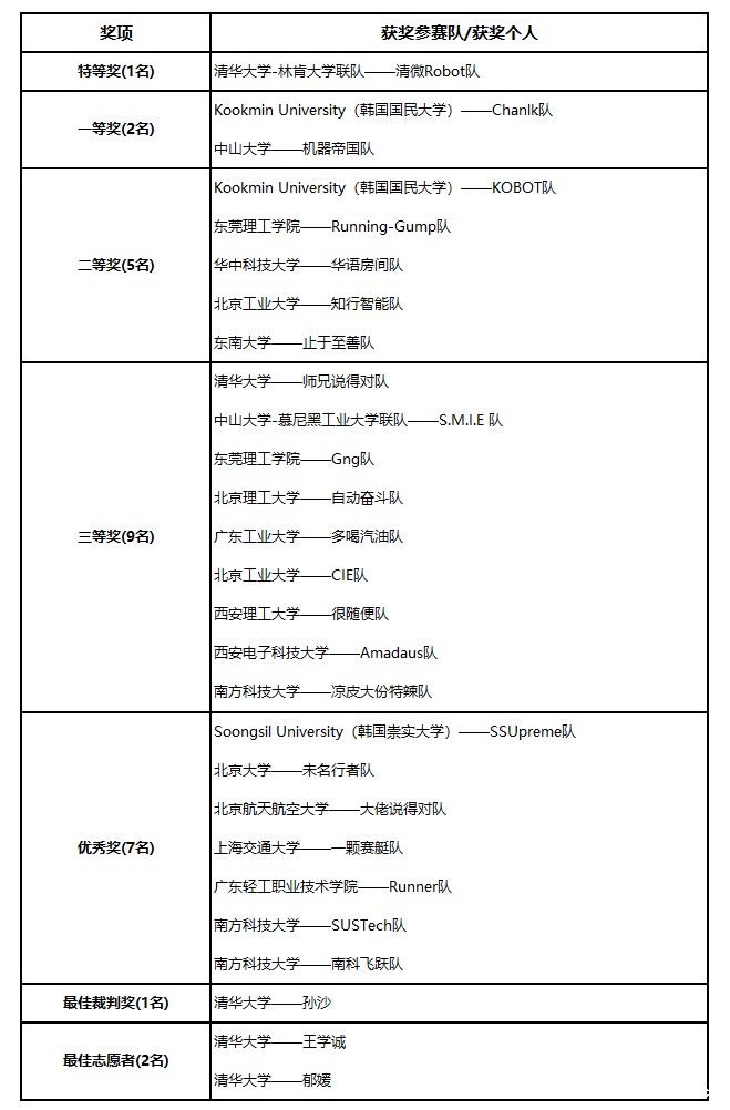 赛事期间,选手们展现了优秀的编程能力。最终评选出特等奖1名,一等奖2名,二等奖5名,三等奖9名,优秀奖7名。清华大学与英国林肯大学组成的联队-“清微Robot队”以全程零失误的绝对优势,荣获特等奖。