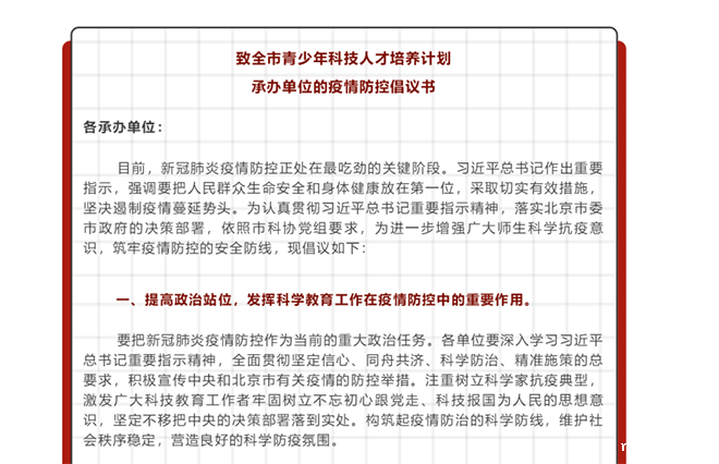2月24日北京青少年科技中心面向全市人才培养计划承办单位发起疫情防控倡议书