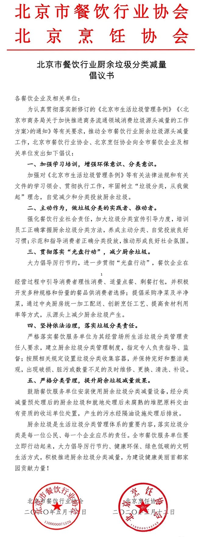 为认真贯彻落实新修订的《北京市生活垃圾管理条例》《的通知》等有关要求,推动全市餐饮行业厨余垃圾源头减量工作,北京市餐饮行业协会、北京烹饪协会向全市餐饮企业及相关单位发出《北京市餐饮行业厨余垃圾分类减量倡议书》。