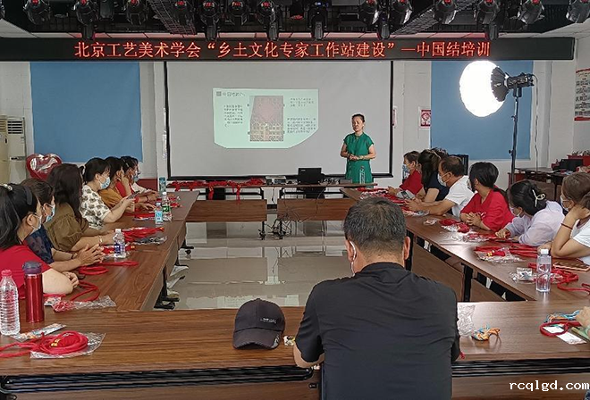图为:启动仪式当天下午,非遗项目“巧艺结艺”代表传承人周巧仪老师为窑湾村的学员们传授中国结的编织技巧。