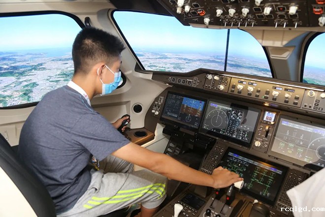 据介绍,C919科普模拟机采用真实飞机驾驶舱进行1:1复制,配备有5通道液晶视景显示和教员台系统,并预装大量定制化精细视景机场与丰富的天气场景,使体验者有身临其境的驾驶感受。