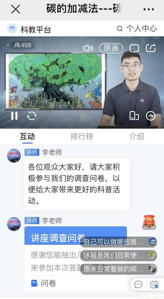 参与直播的群众纷纷表示:讲座内容详实,事例丰富,既有政策性、又有实践性,具有很强的科普性,要从选乘公共交通工具、使用无纺布购物袋、随手关灯、空调温度避免过低或过高等小处做起,积极践行绿色生活方式,争做碳达峰碳中和亲历者、宣讲者、实践者,为碳中和、碳减排贡献自己的力量。科普讲座达到了“教育一人、带动一家、影响一片”的良好效果,形成崇尚绿色低碳、循环发展的良好氛围。